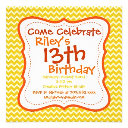 This invitation is shown as a 13th birthday party invitation, but these cute birthday party invitation templates can easily be used for a kids or adults, or can be customized for any type of party or event. Simply fill in the text with your own party details. If you want to change the color of the text or rearrange things, simply use the orange "Customize It" button. The back of the invitation has the same colorful pattern as the front side.