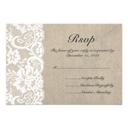 This custom wedding RSVP card is the perfect combination of traditional and trendy. The burlap background is perfect for a rustic or vintage themed wedding and the lace accent adds a classic, romantic touch. This coordinates perfectly with matching invitation. Email me for custom colors! NOTE - This is a high-quality printed image of burlap, lace, & ribbon; this invitation does not contain actual burlap, lace, or ribbon. Thanks!